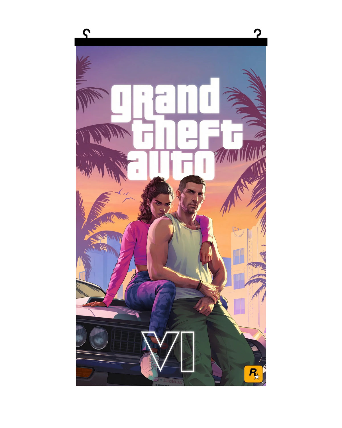 Colección de posters de GTA VI con barra de montaje incluida. Diseños que capturan la esencia de Vice City. Tamaño de 50cm x 89cm.
